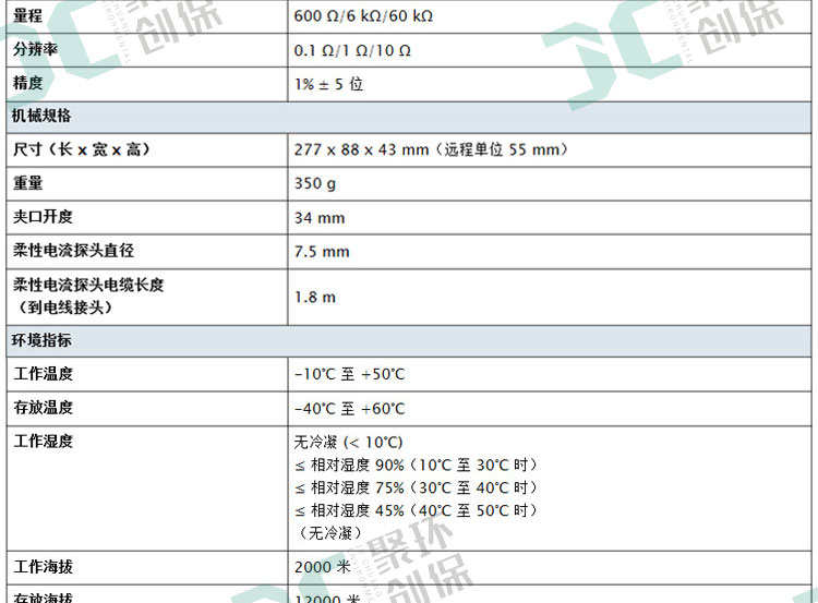 校准后可保持 1 年的精度,工作温度为 18 °C 到 28 °C,相对湿度为 0 % 到 75 %。精度规格形式如下: ±(读数 % + 有效位数)。通用技术指标: