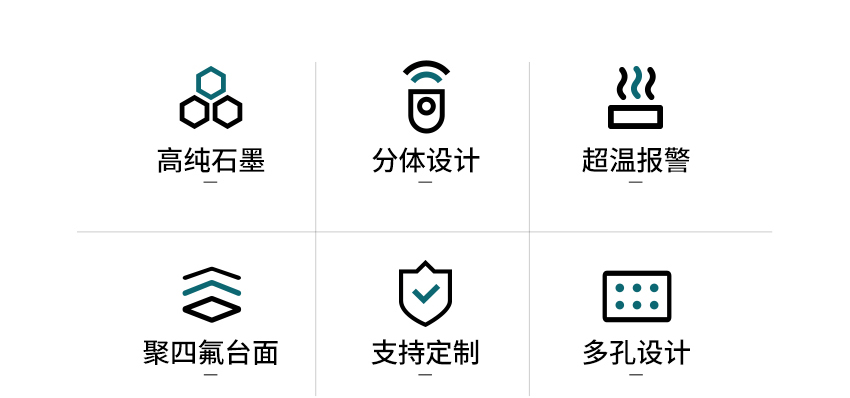 - 石墨体表面喷涂特氟龙涂层,使其具备易清洁、耐腐蚀的特性。
