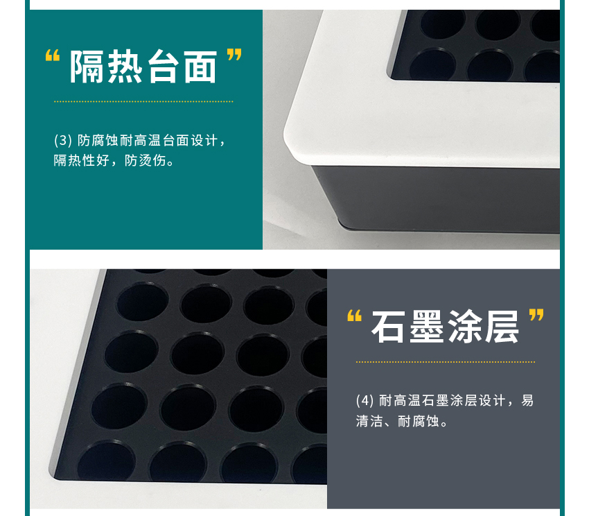 - 聚四氟乙烯台面,不仅不易被腐蚀,还具有良好的隔热性,能有效防止烫伤,可在强酸强碱等恶劣环境中放心使用。